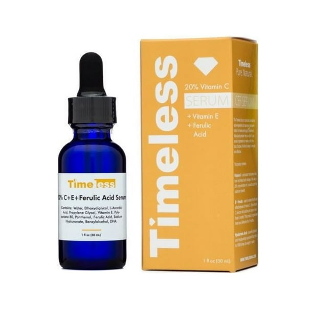 Timeless skin care 20 percent vitamin c plus e ferulic acid serum, 1 fl. Effective for up to 72 hours after first applying. Also contains vitamin e and ferulic acid, used to extend the life and effectiveness of vitamin c. New timeless 20% vitamin c vitamin e ferulic acid serum 1 fl oz / 30 ml.